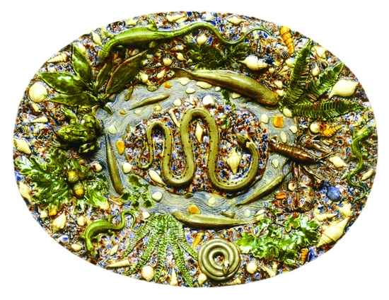 伯納德·帕里希既是一位富有創(chuàng)造力的陶藝家,也是一位嚴(yán)肅的自然研究者。他的知識主要源于直接觀察,因此他還準(zhǔn)備了一個(gè)專門存貯動(dòng)物標(biāo)本的百寶箱。他對自然的研究對其陶藝創(chuàng)作有所啟發(fā),而他的陶藝也直接使用花卉與植物模型塑造。