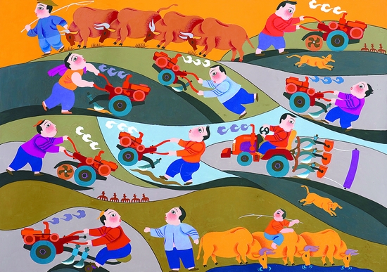 農(nóng)民畫反映著中國7億農(nóng)民的心聲,它是大眾文化,因而也是主流文化。農(nóng)民畫是有組織、有輔導(dǎo)、有個性的美術(shù)創(chuàng)作活動,在民間繪畫中呈現(xiàn)穩(wěn)定、成熟、發(fā)展的態(tài)勢,是其他民間繪畫無可比擬的。農(nóng)民畫回歸民間文化不是降低的體現(xiàn),而是歷史的復(fù)歸,是民間文化生命力的象征。農(nóng)民畫有助于展示廣大人民群眾對民間文化創(chuàng)造的積極性,借鑒農(nóng)民畫發(fā)展的經(jīng)驗(yàn),發(fā)掘地域文化、民間文化,對于推動社會主義文化建設(shè)、社會主義新農(nóng)村建設(shè)必將產(chǎn)生不可估量的影響。