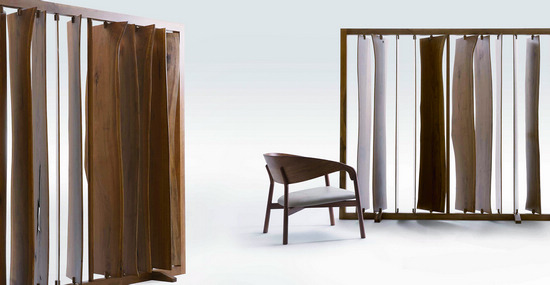 傳統(tǒng)中式屏風(fēng)大都有山水或人物的藝術(shù)繪畫(huà)或雕刻,實(shí)用中渲染著家的藝術(shù)氛圍。青紗屏風(fēng)設(shè)計(jì),利用天然的核桃木肌理及木材本身的殘缺裂紋完美營(yíng)造出中國(guó)傳統(tǒng)潑墨山水的寫(xiě)意之美,每個(gè)屏風(fēng)單片都可以進(jìn)行旋轉(zhuǎn),明與暗,虛與實(shí)可隨意變化,宛如空間里一道青紗。