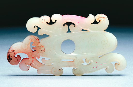 河南永成僖山漢墓出土的西漢白玉透雕韘形佩,形制扁薄,秀美典雅,反映出西漢的裝飾風潮。玉韘最早見于商代,是射箭時鉤弦的用具,功能與板指相似。西漢以后,實用的韘形器逐漸減少,但作為裝飾用玉的韘形佩卻廣為風行。鄂爾多斯高原的伊盟準格爾旗境內西溝畔墓地1979年至1980年發(fā)現(xiàn)并清理出的匈奴貴族女性墓中,隨葬品豐富,出土了精美的頭飾、項飾、腰帶飾等裝飾品。展覽展示的一套貴族婦女頭飾具有顯著的中原文化特色:頭飾由冠飾和耳飾兩部分組成,薄如錫紙的金飾片錘壓出精美的花紋,其中金鑲玉的一對大耳環(huán)在匈奴文物中極為少見。