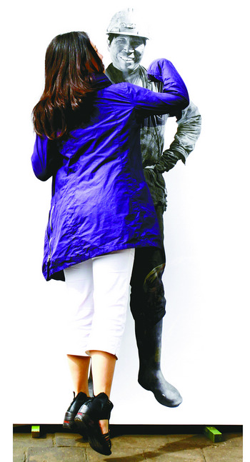 李舸特別提到《上善若水礦工情》,那是一幅觀念攝影作品,一位藍衣白褲的時尚女青年親切擁抱白色紙板上與真人一般高矮的礦工人像。“女孩去擁抱,多生動呀。不一定要拍兩口子之間擦汗、遞水。影像應該有隨意性、去標簽化,應該反映攝影者的心理感受。”