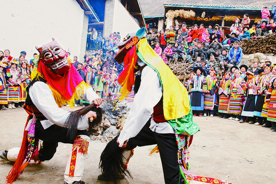 “甘晝”是一種情景性儺舞,由四個男性頭戴女性微笑面具、身著民族短裝、外罩花坎肩、雙手持牛尾刷表演。甘晝是表現婦女養育孩子、做飯、縫制衣服等操持家務的組舞。