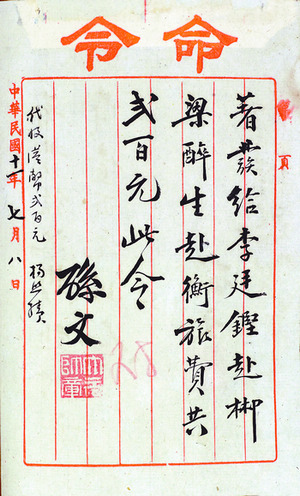 孫文飭發(fā)李廷鏗、梁醉生旅費手令