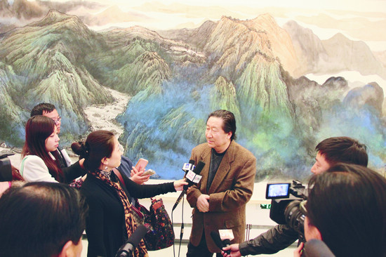 中國(guó)國(guó)家畫院院長(zhǎng)楊曉陽(yáng)在畫展現(xiàn)場(chǎng)接受媒體采訪