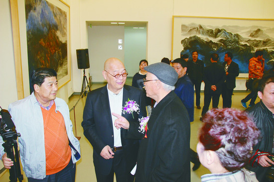 萬(wàn)鼎與原陜西國(guó)畫院院長(zhǎng)苗重安在畫展上交談