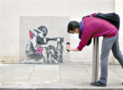 《被奴役的童工》描繪的是一個(gè)孩子在制作國旗。該畫被視為紀(jì)念女王登基60周年而作,于2012年5月出現(xiàn)在倫敦伍德格林的“一鎊店”外墻上。不過在今年2月,它卻從“一鎊店”外墻上神秘消失,并于同月出現(xiàn)在邁阿密的拍場(chǎng)上。