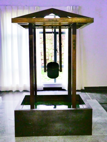 夏和興的《觀器論道》,走“極簡”風,四根鐵條搭出架子,中間懸置水桶,架子上刻“虛則欹,中則正,滿則覆”的文字,水流過歪斜的空桶,將它灌平,持續注水,則水桶傾覆——這一來自《荀子·宥坐》典故與靈感的雕塑作品,讓人想起“謙受益、滿招損”和“日中則移,月滿則虧”的中國古語,又與仰韶文化的尖底瓶在6500年之后遙相呼應,成為近日在深圳坪山雕塑藝術創意園,由中國雕塑學會等單位主辦的2013中國雕塑學會20年優秀雕塑作品回顧展上頗受矚目的作品。