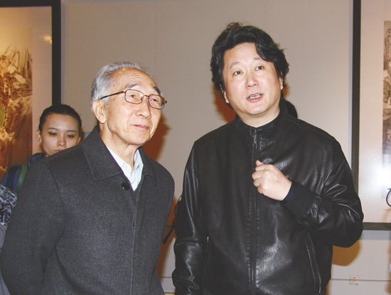 原中國(guó)美協(xié)主席、著名畫家靳尚誼與張江舟在展覽現(xiàn)場(chǎng)