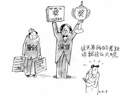 從《超級女聲》、《快樂男聲》到《中國好聲音》、《我是歌手》、《中國最強音》,收視率不斷攀高,制作方也通過廣告和商演賺得盆滿缽盈。這幾檔電視音樂節(jié)目都是花錢購買的國外版權暫且不說,我們喜憂參半地看到,無論是實力派歌手或達人新秀,演唱的歌曲無一不是老歌或經(jīng)典曲目的翻唱。喜的是,經(jīng)典老歌藝術魅力由此可證;憂的是,近年來各個藝術領域都在憂慮原創(chuàng)的匱乏,流行音樂重演唱、輕作品的現(xiàn)象尤甚,本土音樂原創(chuàng)幾乎無處可尋。