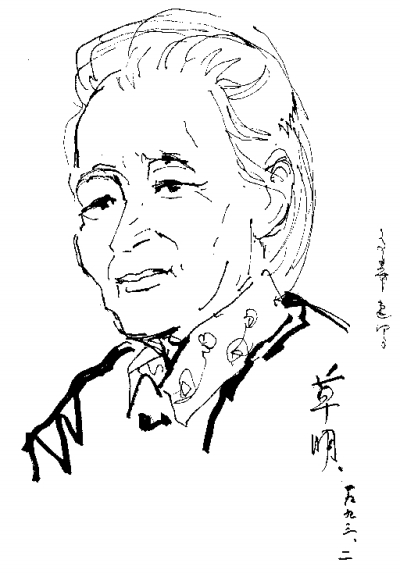 她使用的是油筆,她的字剛勁有力,拿筆的手一點也不顫抖,看不出是一位87歲的老人在寫。她看了半晌羅加喬夫的肖像,若有所思,然后像似自語地說:“我還是第一次見到我的作品的俄文譯者……”她輕輕點了一下頭,接著說,“請代向羅加喬夫家人轉致我的敬意……”我告訴她,羅加喬夫的兒子就是當時的俄羅斯駐華大使羅高壽。她睜大明亮烏黑的眼睛,望著我,既有些高興,又有無限的感激。