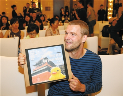 荷蘭藝術(shù)家霍夫曼前日在京宣布將為北京定制一只高約10米的大黃鴨。新京報記者 王遠(yuǎn)征 攝