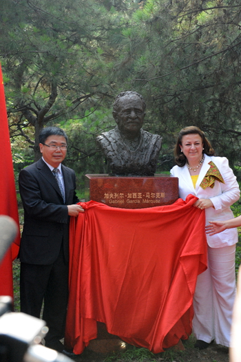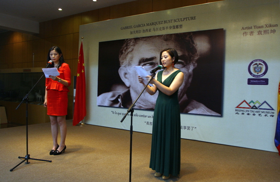 卡爾門薩?哈拉米略大使、趙本堂先生和出席儀式的嘉賓共同為加西亞?馬爾克斯雕塑揭幕。卡爾門薩?哈拉米略大使在講話中介紹了哥倫比亞這位天才的作家、1982年諾貝爾文學獎得主、《百年孤獨》作者加夫列爾的生平事跡,并感謝中國造型藝術家袁熙坤為加西亞?馬爾克斯創(chuàng)作的胸像在朝陽公園落成,象征了中哥友誼。