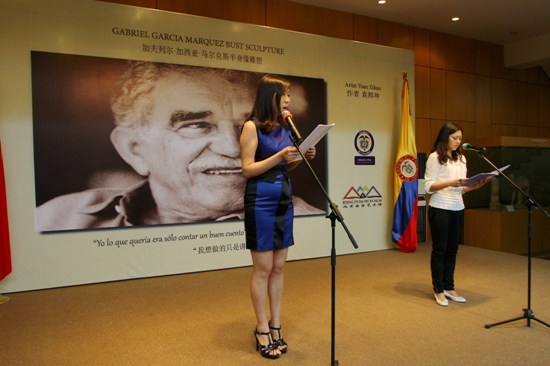 來自哥倫比亞使館和金臺藝術館的青年分別用西班牙語和漢語朗誦了馬爾克斯先生著名小說《百年孤獨》精彩章節(jié) 黃遠 攝