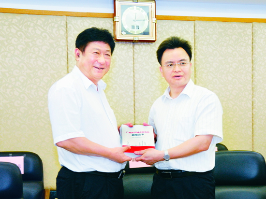 中國廣東省委常委、廣州市委書記萬慶良(右)向市文聯贈送《廣州新型城市化發展政策讀本》