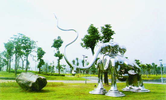 縱觀本次展覽,無論是參展藝術(shù)家的藝術(shù)水準(zhǔn)還是作品質(zhì)量,都可顯示出當(dāng)前中國公共藝術(shù)發(fā)展的整體水平以及新趨勢。中國美術(shù)學(xué)院院長許江的作品《共生會否可能之一》把其油畫中常表現(xiàn)的葵花做成立體雕塑,葵花的形象似乎是大火燃燒以后焦灼而孤獨(dú)挺立的姿態(tài),顯出濃郁的滄桑感,傳達(dá)了藝術(shù)家的反思。陳志光為家鄉(xiāng)特別創(chuàng)作了《圓荷瀉露》這件不銹鋼作品,漂浮在水岸邊的荷花枝葉映射著天光水影,具有很強(qiáng)的視覺觀賞性和夢幻色彩。畢橫的《解·放》則是將變形金剛、機(jī)器人與關(guān)公形象有機(jī)結(jié)合在一起,富有年輕一代的機(jī)器美學(xué)之美。范迪安表示,一件件藝術(shù)作品在水岸、草地、景觀中穿插點(diǎn)綴,與城市環(huán)境互相滲透、映襯、激發(fā),帶給民眾新鮮感。獨(dú)立藝術(shù)構(gòu)思的公共藝術(shù)作品,不是簡單的設(shè)計(jì)或裝飾,它們凸顯出社會空間的文化性,并在與市民的互動中實(shí)現(xiàn)文化的全民共享。