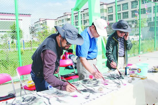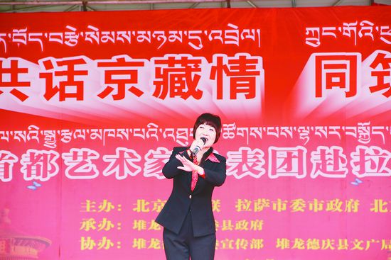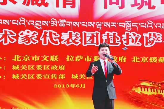 清晨我站在青青的牧場,看到神鷹披著那霞光,像一片祥云飛過藍天,為藏家兒女帶來吉祥……”當歌手高鵬飛唱著藏族群眾熟悉和喜愛的歌曲《天路》走下舞臺,演出現(xiàn)場一片沸騰,合唱聲、拍掌聲一浪高過一浪,而高鵬飛脖子上潔白的哈達也堆成了一座小小的“雪山”。這是近日發(fā)生在西藏堆龍德慶縣羊達鄉(xiāng)通嘎村的一幕。6月19日至28日,由北京市文聯(lián)組織的首都藝術(shù)家一行近60人來到西藏拉薩,為當?shù)剞r(nóng)民、市民、援藏工人、駐藏部隊官兵送去了5場慰問演出,其間還舉辦了4場書畫筆會,所到之處受到熱烈歡迎。