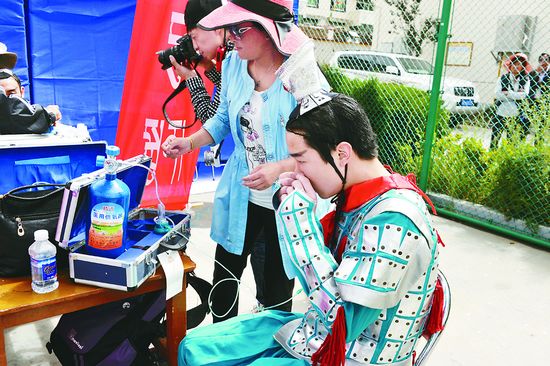 臺上表演舞蹈《秦王點兵》的幾個小伙子賣力演出,一下臺他們就因嚴重缺氧吸起了氧氣 梅 雁 王春梅 攝