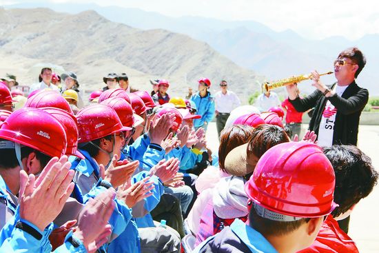 而在城關(guān)區(qū)納金鄉(xiāng)塔瑪村,青年演奏家姜旭從臺上走到藏族村民中間,分別用五六種民族管樂樂器演奏了《唱支山歌給黨聽》《十月是你的生日》《北京的金山上》等歌曲,動聽的旋律感染著觀眾,引得藏族群眾紛紛為他獻上哈達。演出時還意氣風(fēng)發(fā)的他一結(jié)束演出,就趕忙走到吸氧處大口大口吸起了氧氣,“吹奏樂器要消耗很多氣力,雖然演出時有點缺氧不太舒服,但是幸好演出沒受影響。”此次是姜旭第一次來西藏,為了能夠成行,他推了好幾場商業(yè)演出,姜旭告訴記者,看到觀眾們那么熱情,他很感動,也很受鼓舞,“這是真正的為人民服務(wù),很接地氣,以后有機會我還來!”在拉薩市文體中心工地,露天的演出場地,毒辣的日頭曬得人頭昏眼花,演員們卻冒著高溫流著汗水奉獻著高質(zhì)量的演出。口技演員方浩然來到工人中間,惟妙惟肖地模仿起鳥、藏獒、獅子、羊、驢等十多種動物的叫聲,逗得大家哈哈大笑。方浩然在上場前特意吸了很長時間的氧氣,為的是保證演出質(zhì)量。他告訴記者,來西藏之前他還一直擔心這次能不能在高原上完成演出任務(wù),來了以后雖然有些高原反應(yīng),但基本還算適應(yīng)。“與觀眾互動時,看到大家熱烈的反應(yīng),再苦也值得!”