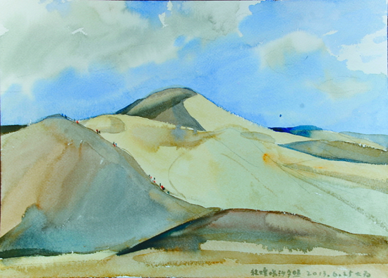 近日,中國(guó)文聯(lián)、中國(guó)美協(xié)組織采風(fēng)團(tuán),赴甘肅河西走廊舉行“追尋中國(guó)夢(mèng)——美術(shù)家寫生創(chuàng)作基層行”活動(dòng)。劉大為、馬新林、孫志鈞、駱獻(xiàn)躍、王界山、忻東旺、康蕾等來(lái)自全國(guó)各地,涵括中國(guó)畫、油畫、版畫、水彩粉畫等多個(gè)畫種的美術(shù)家,經(jīng)過(guò)武威、張掖、嘉峪關(guān),直至敦煌,行程1200多公里。在綿亙千里的絲綢之路上,他們遍覽黃河、草場(chǎng)、雪山、戈壁、荒漠等變幻多彩的自然景觀,體驗(yàn)裕固族、哈薩克族的風(fēng)土人情,描繪肅南的丹霞地貌奇觀,登臨萬(wàn)里長(zhǎng)城西端險(xiǎn)要關(guān)隘嘉峪關(guān),觀賞魏晉壁畫墓,流連并震撼于敦煌莫高窟的絕美壁畫和雕塑。本版擇其部分美術(shù)家的寫生作品,以饗讀者。
