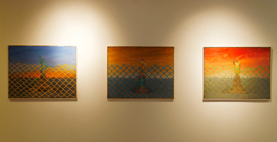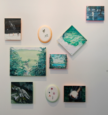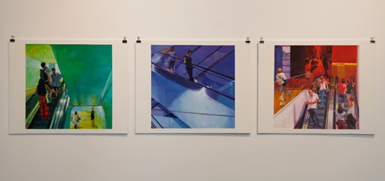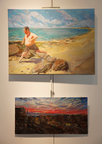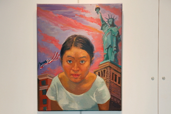 來(lái)自中央美院的年輕藝術(shù)家在紐約游歷創(chuàng)作的作品,融入了文化沖擊帶來(lái)的新鮮元素,又隱含著在新文化中的焦慮感。紐約街頭的多元文化特征體現(xiàn)在杜鵬驕和丁鈺的作品。杜鵬驕抓住了這個(gè)五光十色的大都市不同族裔、職業(yè)、性別的面孔,拼貼在一起,像是快速閃回的膠片。丁鈺則捕捉了在時(shí)代廣場(chǎng)跳動(dòng)的股票信息前的一張亞洲面孔——充滿好奇的自己的面孔。魏穎同樣也畫(huà)了自畫(huà)像不過(guò)她所表現(xiàn)的是處于畫(huà)室內(nèi)的場(chǎng)景,畫(huà)面中鏡子分割了遠(yuǎn)處的風(fēng)景,同樣自身也處于風(fēng)景之中。而趙沛然及曲丹兒把自己的切身感受明確的體現(xiàn)在畫(huà)面中,前者畫(huà)了MOMA美術(shù)館彩色燈光的扶梯,用幾何分割的構(gòu)圖試圖闡釋人與人,人與空間的關(guān)系,后者則是把在紐約生活的瑣事串聯(lián)起的細(xì)節(jié)以一種超現(xiàn)實(shí)的手法,錯(cuò)亂的空間,以及斑斕的色彩記錄在畫(huà)面中。范墨把他童年記憶中的集體合影中移植入美國(guó)文化的卡通符號(hào)。袁偉和周棟則抓住了美國(guó)中產(chǎn)階級(jí)夏日的典型生活——海灘度假。周棟筆下的胖女人專心地曬著太陽(yáng),用粗獷的筆觸表現(xiàn)出曬紅皮膚上新鮮泥土的痕跡。苑瑗以一組尺寸可變的小油畫(huà)表現(xiàn)了自己在紐約的狀態(tài),沒(méi)有摩天大樓和車水馬龍,安靜的湖泊和星辰讓人出離喧囂。趙一霓的一組風(fēng)景油畫(huà)延續(xù)了自己對(duì)中國(guó)傳統(tǒng)文人畫(huà)內(nèi)觀境界的追求,近乎抽象的線條注重對(duì)內(nèi)心的反映,藝術(shù)家說(shuō)在紐約的體驗(yàn)讓她找到了更準(zhǔn)確的語(yǔ)言,在圖像的表達(dá)上也更自由。李興達(dá)的《墻》則用幽默的語(yǔ)言反映出無(wú)所不在的隔閡。自由女神、毛澤東和麥當(dāng)勞小丑站在紀(jì)念碑的基石上,以統(tǒng)一的姿勢(shì)揮手。觀者的視線被雕像前橫空出現(xiàn)的籬笆所阻擋,不知自己身處墻內(nèi)還是墻外。