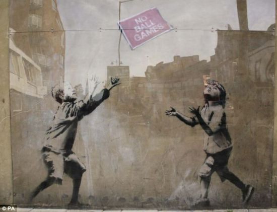 上個月,在倫敦北部被盜的班克斯涂鴉上拍。盡管此次銷售頗具爭議,但它還是以75萬英鎊售出。時隔一個月,另一幅從倫敦北部被扯下來的涂鴉又將登上拍場。這幅涂鴉名叫《無球游戲》是從托特納姆格林的商店外墻上被移走的,它將于明年拍賣,而主持拍賣的依舊是Sincura集團——曾在5月安排《被奴役的童工》上拍的公司。