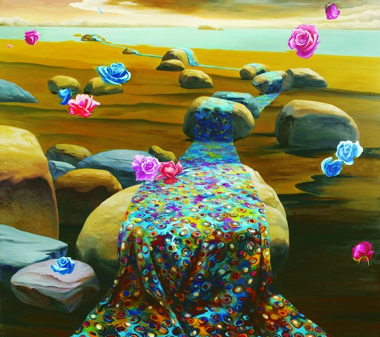 吳洋的油畫虛構(gòu)了一種仿若超現(xiàn)實(shí)主義的空間:廣袤的大地、深邃的山洞、無邊的海岸、包裹著花布的懸浮巨石、飛揚(yáng)的花瓣……細(xì)膩、柔軟的花布輕裹著冰冷、堅(jiān)硬的石頭。這些如同夢(mèng)境一般的圖像,來源于設(shè)計(jì)過花布、擔(dān)任過時(shí)裝設(shè)計(jì)師、創(chuàng)辦過時(shí)裝公司的吳洋2006年居住在加拿大的經(jīng)歷:“北美的文化和自然景觀,像一股強(qiáng)勁的風(fēng),一掃所有的浮躁、做作;特別是那些石頭,我被它們的外表,它們之間的疏密關(guān)系,以及各種各樣的肌理變化深深吸引了。”不去看石頭的堅(jiān)硬、粗獷,只去體現(xiàn)自己熟悉的特質(zhì)——對(duì)顏色的敏感,“女性化、陰柔”的色彩傾向。