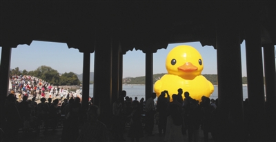 荷蘭藝術家弗洛倫泰因·霍夫曼風靡全球的“大黃鴨”在北京續寫了萬人迷的傳奇。昨日,“大黃鴨”北京之旅的主辦方北京國際設計周組委會在頤和園宣布,從今日開始啟動“大黃鴨”告別北京的倒計時系列活動。與此同時,大黃鴨在頤和園的展期將延長一天至10月27日。