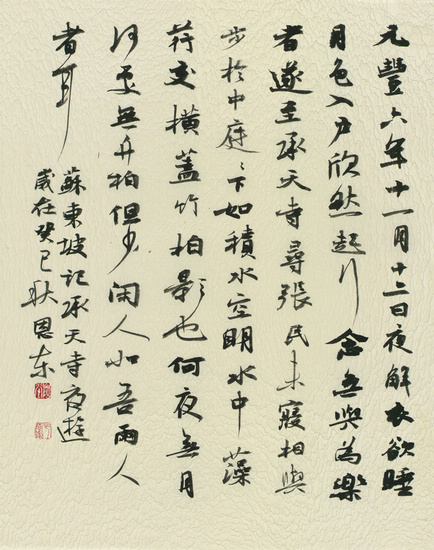 于恩東的行書功力深厚,善于吸納、創變;篆書圓渾端莊、粗獷恣肆,可謂神形兼備。扎實、法度森嚴的唐楷和“二王”功底使其對字的點畫和結體有著極深的造詣,揮墨之間靈動自然之風自現,質樸中透露灑脫,機巧中顯現性情。書法是一門寫心的藝術,于恩東的獨特筆墨范式并非形成于偶然,點畫中蘊含的精致、清雅、秀逸無不顯示出他細心、耐性的心理特征。他一直執著而自信地走著與自己氣質、性情相吻合的經典書法藝術道路,從不為時尚潮流所迷惑,故其書法精巧暢達、簡明清蔚,于清逸中透析高潔的精神,于清剛中顯示倔強的風骨。