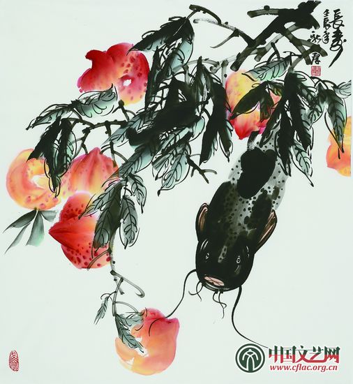 萬新厚的畫開辟了一條新路,因為歷代畫家畫魚是單純的。他的畫魚種類繁多,畫的風格很大氣,用筆用墨很見功底。他用筆落筆很準,線條的變化很老辣,墨用得很活,很有層次感,整個畫的動感、構圖都很有美感——從藝術的角度來說,達到了一定的高水平。他的筆墨雖然從傳統中來,但是打破了傳統;他的創意常有現代生活的那種元素,表現很新穎。
