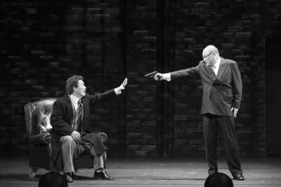 該劇由《最后14堂星期二的課》的導演楊世彭執導,與“14堂課”簡約主義的導演手法不同,《步步驚笑》里楊世彭動用了各種劇場手段來表現這場驚心動魄的“大逃亡”。比如,劇中一段戲仿希區柯克名片《西北偏北》的“皮影戲”十分出彩。眾所周知,希區柯克喜歡在自己的影片里露臉,導演在這一幕的末尾,還讓希區柯克經典的側影以皮影戲的形式出現在幕布上。