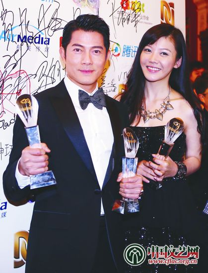 11月18日,最佳男演員獎得主郭富城與最佳女演員獎得主楊子姍在英國倫敦舉行的第五屆萬像國際華語電影節閉幕式暨頒獎儀式后合影。當日,第五屆萬像國際華語電影節在英國倫敦落幕。演員郭富城與楊子姍分別憑借電影《全民目擊》與《致我們終將逝去的青春》獲得最佳男演員獎與最佳女演員獎。 新華社記者 王麗莉 攝