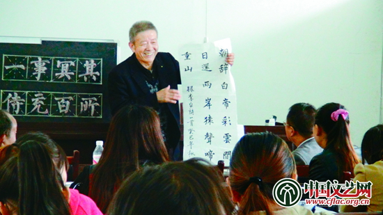 到安順支教的志愿者朱鋌是來自西北敦煌文聯的老主席、書法家,他年近六旬,是三個支教點最年長的文藝志愿者。圖為朱鋌給學校的老師培訓書法