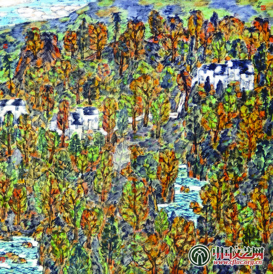 陳向迅,1956年生于浙江杭州。1984年畢業(yè)于中國美術(shù)學院(原浙江美術(shù)學院)中國畫系本科并留校任教;1990年該系山水專業(yè)碩士研究生畢業(yè),師承陸儼少先生?,F(xiàn)為中國美術(shù)學院中國畫系教授、博士生導師。陳向迅的作品重視形式語言的表達,講究筆墨表現(xiàn)的傳統(tǒng)意味,追求厚重而充實、豐富而精致的整體效果和畫面構(gòu)成。多年來,他始終在思考中國畫該怎樣不失傳統(tǒng)、又與當代接軌。雖然其每一次創(chuàng)作探索,會引起一些爭議,但他堅持求“變”,在當代水墨表現(xiàn)語言實驗和變革方面的探索,是較為成功的一位。在展覽中可以看到陳向迅作品的一大特色:從重彩寫意的五光十色,到水墨語言的深沉厚重。從他本科畢業(yè)創(chuàng)作用丙烯黑色替代了傳統(tǒng)的墨,到《課徒》系列嘗試不同的黑顏料作畫,不斷試驗傳統(tǒng)中國畫顏料如何與其他不同性質(zhì)顏料結(jié)合使用。他的畫中,色與墨融合多變,常用豐富的小色塊筆觸代替平涂的大色塊,讓設色不流于簡單的渲染,講究水墨設色的完整精致。在他看來,中國畫設色是對筆墨層次的一種色調(diào)補充,而不僅僅是追求色彩自身各種對比關系的表現(xiàn)。重要的是,中國畫設色在于心境和意境的創(chuàng)造,創(chuàng)作寫意山水畫時,不必太關注真實景物中的光影關系和色彩變化,而是要關注情景交融中的內(nèi)心感受和傾訴。