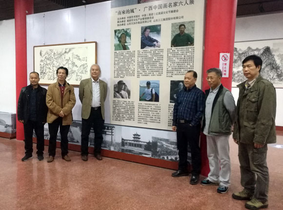 圖為廣西中國(guó)畫(huà)名家謝麟(左三)、陽(yáng)山(左二)、余永健(右二)、白曉軍(右三)、王慶軍(右一)、潘正華(左一)在紅高粱之約·丹青高密·南來(lái)的風(fēng)畫(huà)展現(xiàn)場(chǎng)合影。