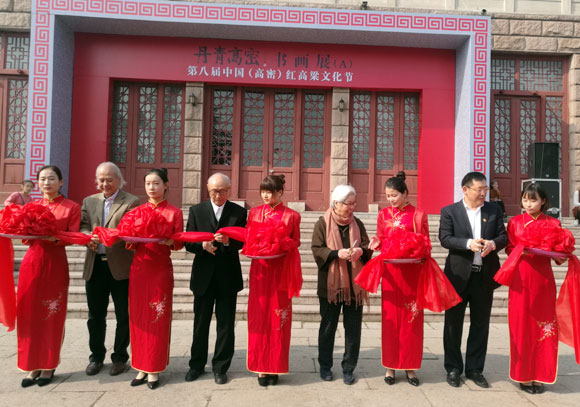 圖為中共高密市委書(shū)記楊建華(圖右一)、著名美術(shù)評(píng)論家邵大箴(圖左二)、著名畫(huà)家單應(yīng)桂(圖右二)、著名畫(huà)家謝麟(圖左一)為第八屆中國(guó)(高密)紅高粱文化節(jié)紅高粱之約·丹青高密書(shū)畫(huà)展剪彩。