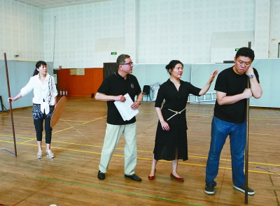 導演王湖泉(左二)在給主要演員排第二幕戲,王威(左一)飾演布侖希爾德,劉珊(右二)飾演弗麗卡,王海濤(右一)飾演沃坦。