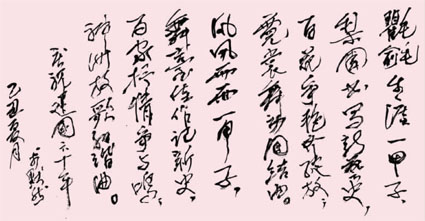 中國(guó)劇協(xié)名譽(yù)主席李默然為中國(guó)劇協(xié)成立60周年題詞“氍毹生涯一甲子,梨園書(shū)寫(xiě)新藝史,百花爭(zhēng)艷齊綻放,霓裳舞動(dòng)團(tuán)結(jié)曲。風(fēng)風(fēng)雨雨一甲子,舞臺(tái)佳作記新史,百家抒情爭(zhēng)與鳴,神州放歌和諧曲。”