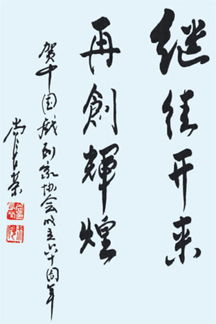 中國(guó)劇協(xié)主席尚長(zhǎng)榮為中國(guó)劇協(xié)成立60周年題詞“繼往開(kāi)來(lái),再創(chuàng)輝煌。”