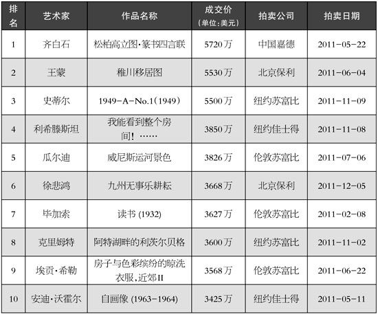 從以上表格不難看出,2011年全球藝術品成交前十名,中國的齊白石、王蒙、徐悲鴻作品占據三席,充分顯示了中國在全球藝術品交易中的重要性。據了解,2011年,中國藝術品拍賣百萬美元以上的作品有684件,這一數量已經超過美國。而在2011年全球藝術品成交最高價前100名中,其中的30件誕生于香港、北京和杭州。