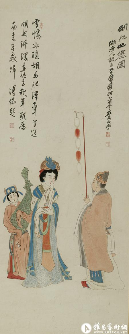 張大千《明妃出塞圖》描繪了昭君隨使出塞的一幕,繪制該作的時間已在大千自敦煌歸來后,故人物的線條雖不改其秀麗但益趨圓勁,設色雖絢麗而不失清雅明凈,是互參敦煌壁畫以及《韓熙載夜宴圖》以后的新境界。大千將明妃畫得明艷照人,神色卻流露內心淡淡哀怨,楚楚可憐,發黑如絲絨,是以突顯人物神采專用于仕女眼睛和頭發的檳榔墨所染,與泥金勾勒的石黃、朱砂、石青鳳冠,形成強烈的對比。1945年12月,張大千為籌集資金,購買由長春溥儀偽滿洲國宮內散出的名畫,在中山公園水榭與于非闇合開畫展,畫上有溥儒的題詩,所以此畫有可能是當時展出的作品之一。