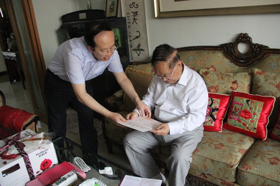 6月13日,一個難得的清涼早晨,中國文聯名譽主席周巍峙迎來了他的97歲生日。中國文聯黨組書記趙實特意為周老的生日寫了賀卡。中國文聯黨組成員、副主席左中一受趙實委托,在中國文聯辦公廳主任夏朝華等陪同下為周老送上生日祝福。在周巍峙家中,左中一代表中國文聯為祝賀周老97歲華誕,送上了精心準備的生日鮮花、蛋糕和賀卡,祝愿周巍峙這位文藝老戰士健康長壽,藝術之樹常青。