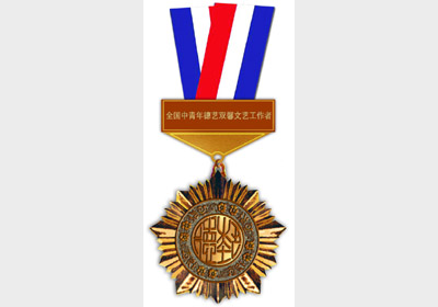 中國(guó)文聯(lián)網(wǎng)訊:獎(jiǎng)?wù)乱蚤W閃發(fā)光的五角星為外輪廓,仿佛又像是一朵盛開(kāi)的鮮花。花蕊由篆書“德藝”二字構(gòu)成,筆畫依圓造型,具有中國(guó)傳統(tǒng)篆刻印章的古樸韻味。四周再輔以花紋裝飾圖案,增強(qiáng)了視覺(jué)效果,該圖案取材于貴州中南部苗族女子服飾上的花邊紋樣,借鮮花來(lái)象征“百花齊放”的文藝方針。